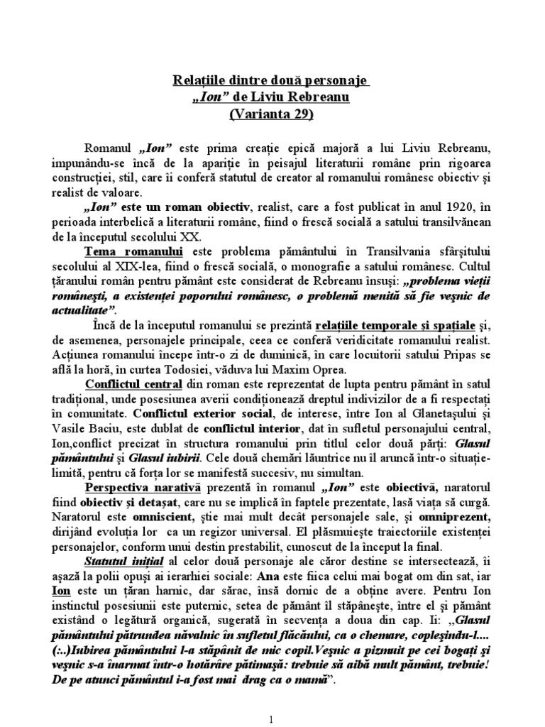 Romanul este specia genului epic in proza de mare întindere cu o acțiune desfășurată pe mai multe planuri narative, cu personaje numeroase și o intriga complexă. Pana la aparitia romanului ion in 1920, romanul romanesc personajul ion este unul de referinta in literature romana, ilustrand tipul taranului dornic de a avea pamant. Ion este personajul central din roman,dominand intreaga lume, prezentat prin tehnica basoreliefului. 1 septembrie 1944, valea mare, judeţul argeş) a fost un romancier, dramaturg şi academician român. Liviu rebreanu este creatorul romanului românesc modern, deoarece scrie primul roman obiectiv din literatura româna, ion si primul roman de analiza romanul ion merita citit pentru ca, pe langa detaliile satului ardelean romanesc surprinse de liviu rebreanu , putem observa si structura personajului.