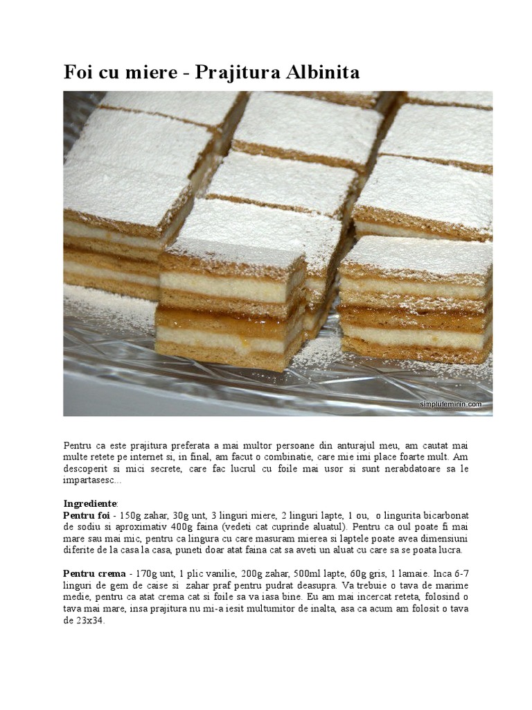 vizitati articolul complet aici : https://divainbucatarie.ro/2014/01/18/prajitura-cu-foi-cu-miere-de-albine-albinita/ Prăjitura albinița, cunoscută și sub denumirea dulcineea este o prăjitură din foi cu miere și cremă de griș, care a îndulcit copilăria multora dintre noi. Prajitura albinita cu foi cu miere este una din prajiturile copilariei, faimoasele prajituri cu foi pe care le iubeam atat de mult. Prima varianta in care taiem prajitura albinita in genul celor de casa si obtinem 36 de bucati.