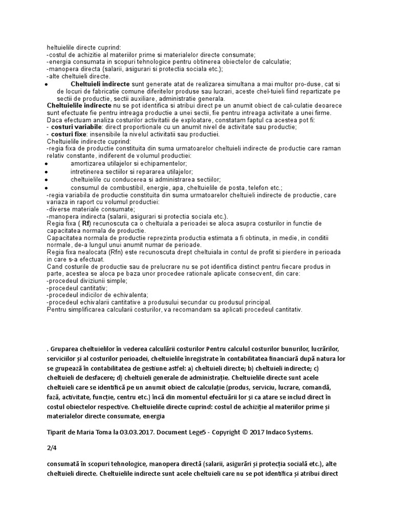 Costurile directe şi indirecte dezvoltate pe articole de calculaţie ( nomenclator de referinţă):