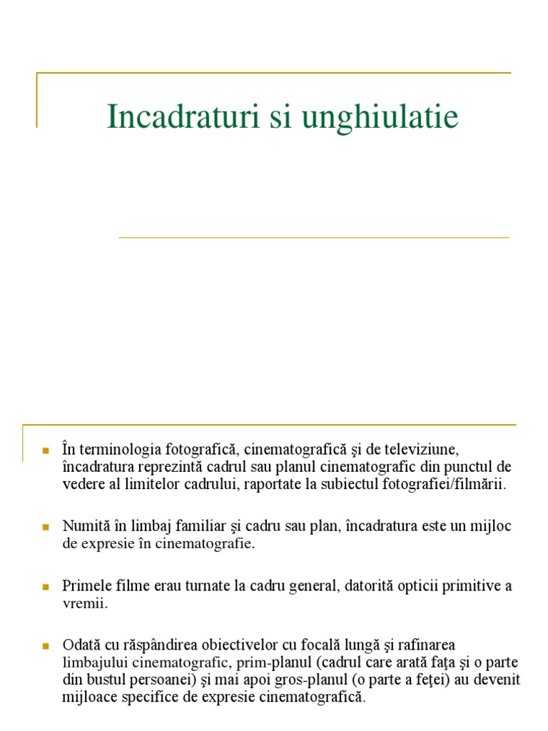 Nicio culoare nu mai distrugea monotonia întunericului care pusese stapanire pe tot ce reprezenta ea. Noile culori în italia, regiunile galbene, portocalii și roșii: Cadru cinematografic în care interpreții sunt filmați de aproape.