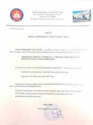 vizitati articolul complet aici : http://www.artebrasov.ro/despre-noi/cariera/concursuri/ Pentru ocuparea postului contractual vacant sau temporar vacant, candidații trebuie să îndeplinească următoarele condiții generale, conform art. legea nr.82/1991 a contabiliatii. Şcoala gimnazială făurei anunţă organizarea unui concurs pentru ocuparea postului contractual vacant de administrator financiar.