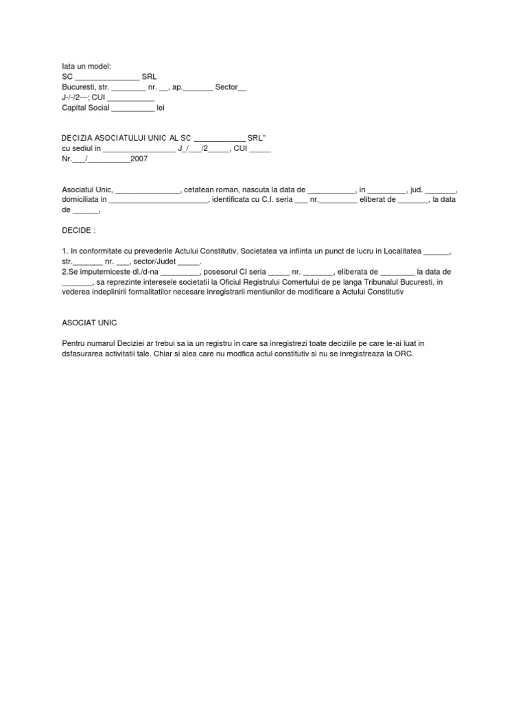 Fotocopii certificat de inregistrare firma, act constitutiv si acte de identitate redactare hotarare aga/decizie asociat unic; Salvaresalvați decizia asociatului unic pentru mai târziu. < inchidere punct de lucru si hotarare deschidere punct lucru, model hotarare aga deschidere punct de lucru, hotarare asociat unic decizie aga pentru deschiderea unui punct de.